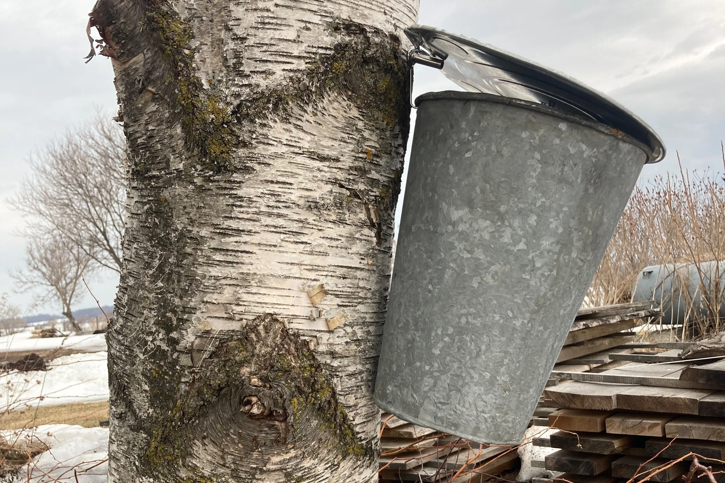 Birch tree being tapped for sap in Kinburn, ON just West of Ottawa
