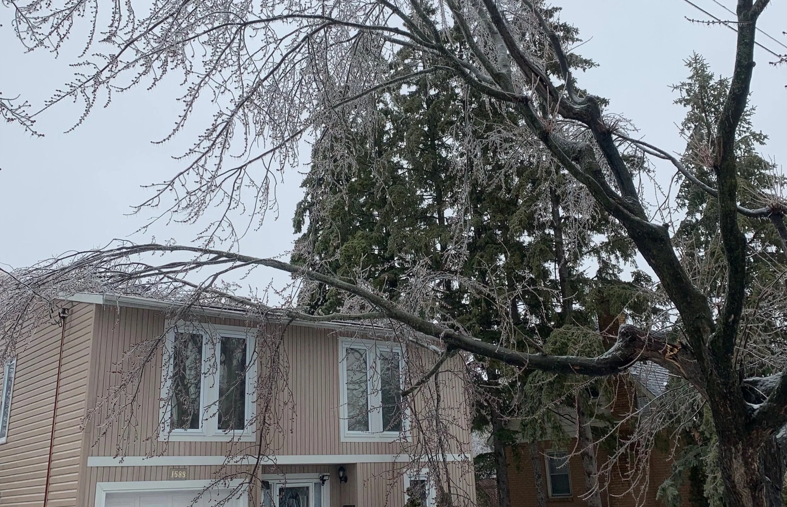 The April 2023 ice storm coated Ottawa in a thick layer of freezing rain, causing heavy branches to snap under the weight. This image shows a fallen tree branch resting on a home, a common sight after the storm. Ice-damaged trees pose ongoing risks, making professional tree care essential for safety and recovery.