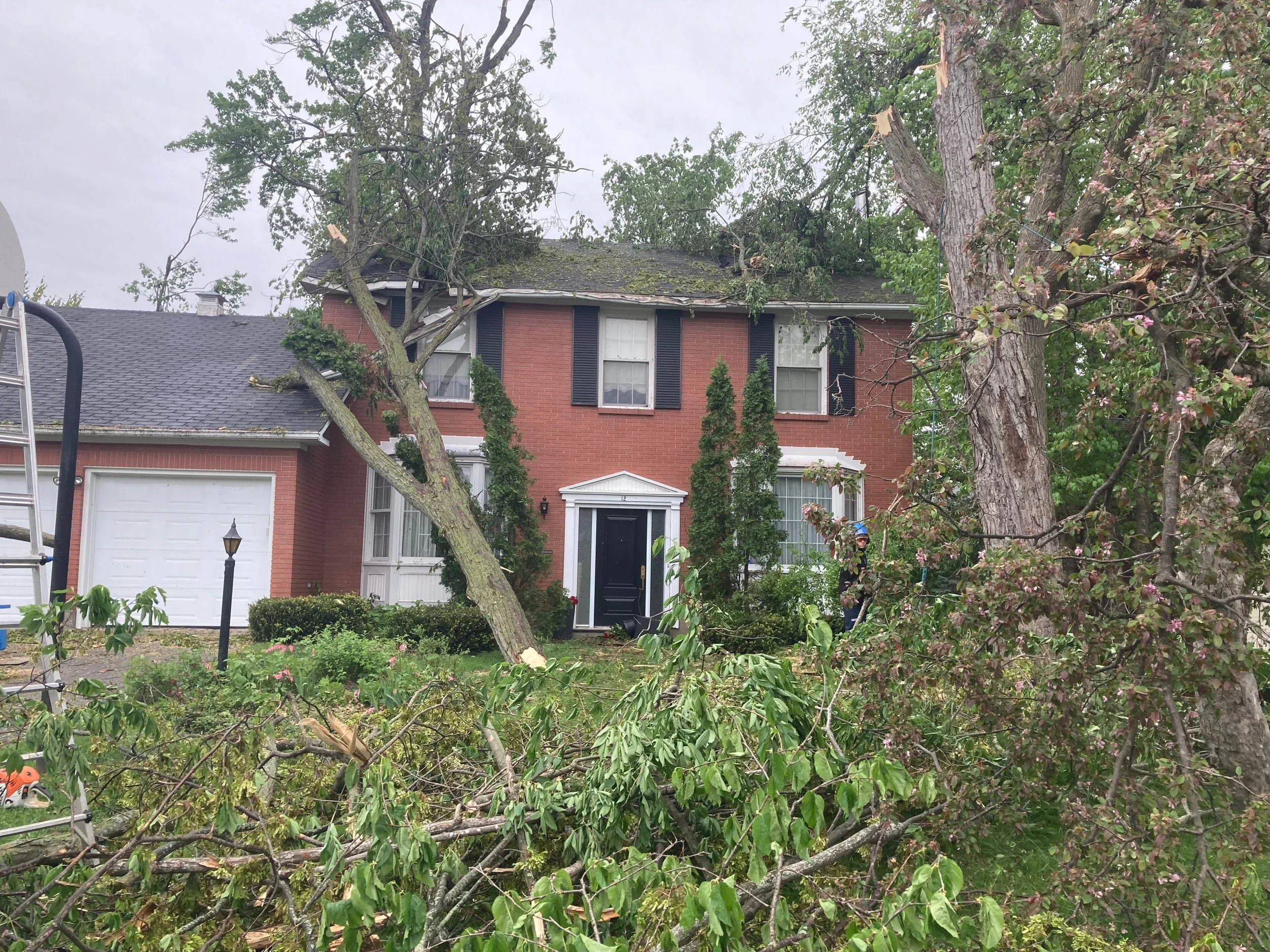The devastating Ottawa tornado of 2018 left destruction in its wake, uprooting trees and damaging homes. This image captures the aftermath, as a massive tree rests on a house, highlighting the urgent need for emergency tree services.